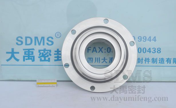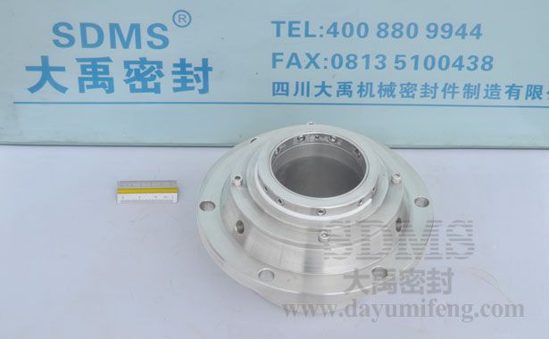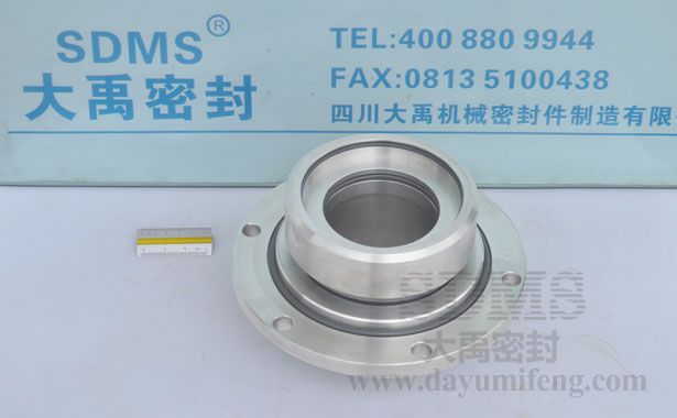 ? ? ? SDMS-80S機(jī)械密封只能用于含顆粒較少的場合,如某廠含砂重油泵,含砂量3%左右。顆粒太多時(shí),容易在動(dòng) 環(huán)密封圈處阻塞,使動(dòng)環(huán)失去浮動(dòng)性。該圖左面的端面與介質(zhì)接觸,設(shè)計(jì)成靜止內(nèi)流式,顆粒不易進(jìn)入摩擦副,動(dòng)、靜環(huán)的密封圏也得到了保護(hù)。另外用沖洗液進(jìn)行沖洗,中間充封液進(jìn)行“封堵”,使顆粒破壞機(jī)械密封的可能性減到最小。